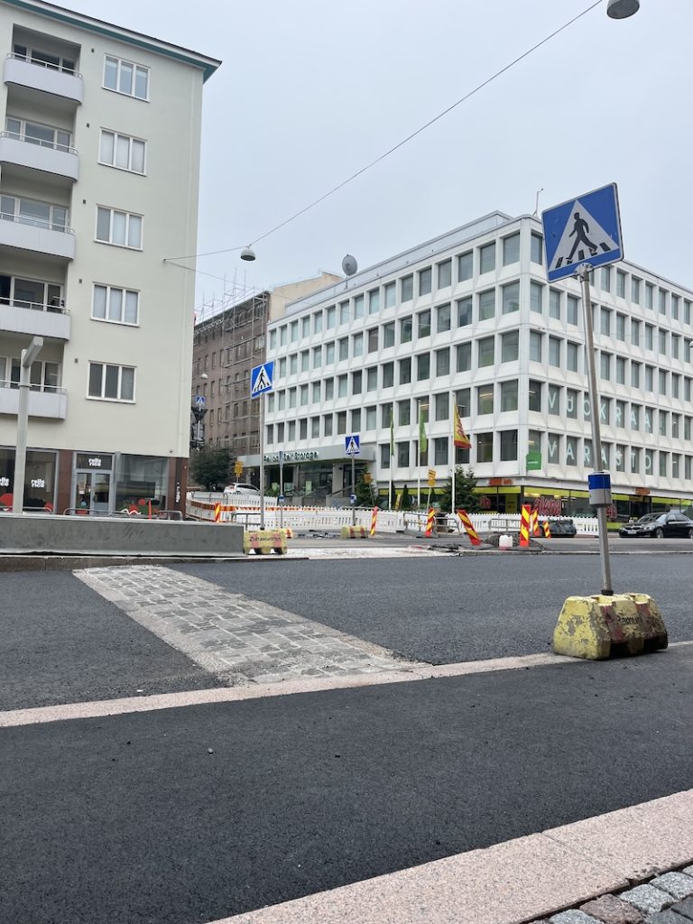 Uuden korotetun suojatien muoto näkyy jo Päivärinnankadun risteyksessä, Kansaneläkelaitoksen tulevan ratikkapysäkin kohdalla. Suojatiemaalauket ovat tulossa vielä seuraavaksi.