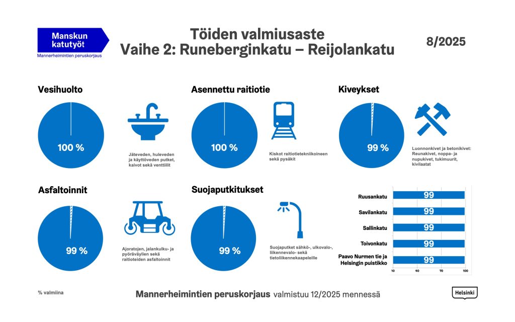 Mannerheimintien katutöiden työmaan valmiusasteiden seuranta päättyy tähän.