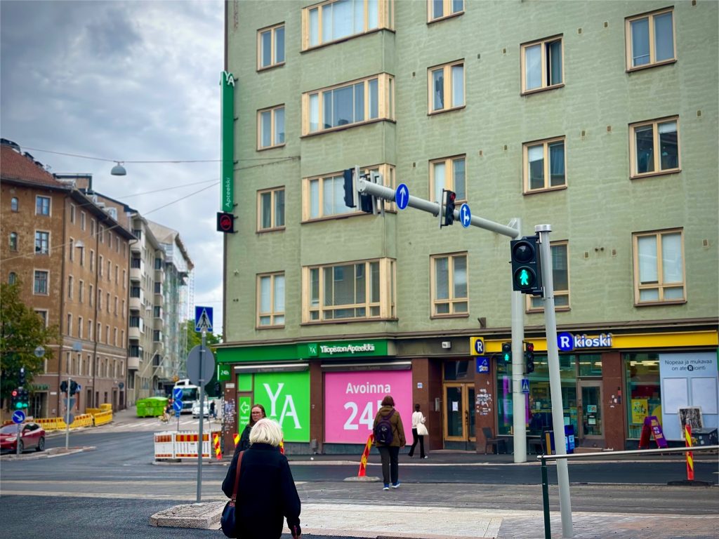 Tässä risteyksessä jalankulkijoiden kärsivällisyyttä on koeteltu verrattain pitkään, mutta nyt kiertomatka risteyksen ympäri lyheni kertaheitolla ainakin vähän.